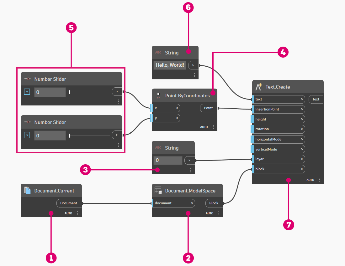 > 5. We defined the X and Y coordinates of the Text insertion point using two *Number Slider* nodes.