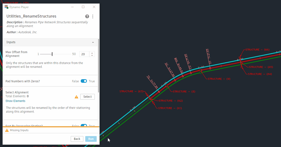 <figure><img src="https://1734247194-files.gitbook.io/~/files/v0/b/gitbook-x-prod.appspot.com/o/spaces%2FY5ZuHF3yuXFWp1C46ZSo%2Fuploads%2Fgit-blob-3598eb607606725b45d83237a50d95915f18926a%2FUtilities_RenameStructures_Player.gif?alt=media" alt=""><figcaption><p>Running the graph using Dynamo Player and seeing the results in Civil 3D</p></figcaption></figure>
