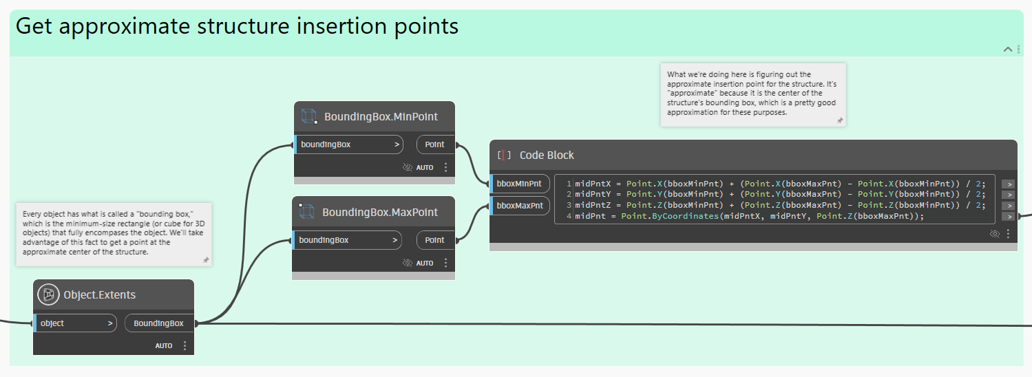 Now that we have the Structures, we need to figure out their position in space so that we can sort them according to their location. To do this, we'll take advantage of the Bounding Box of each object. The **Bounding Box** of an object is the minimum-sized box that fully contains the geometric extents of the object. By computing the center of the Bounding Box, we get a pretty good approximation of the Structure's insertion point.