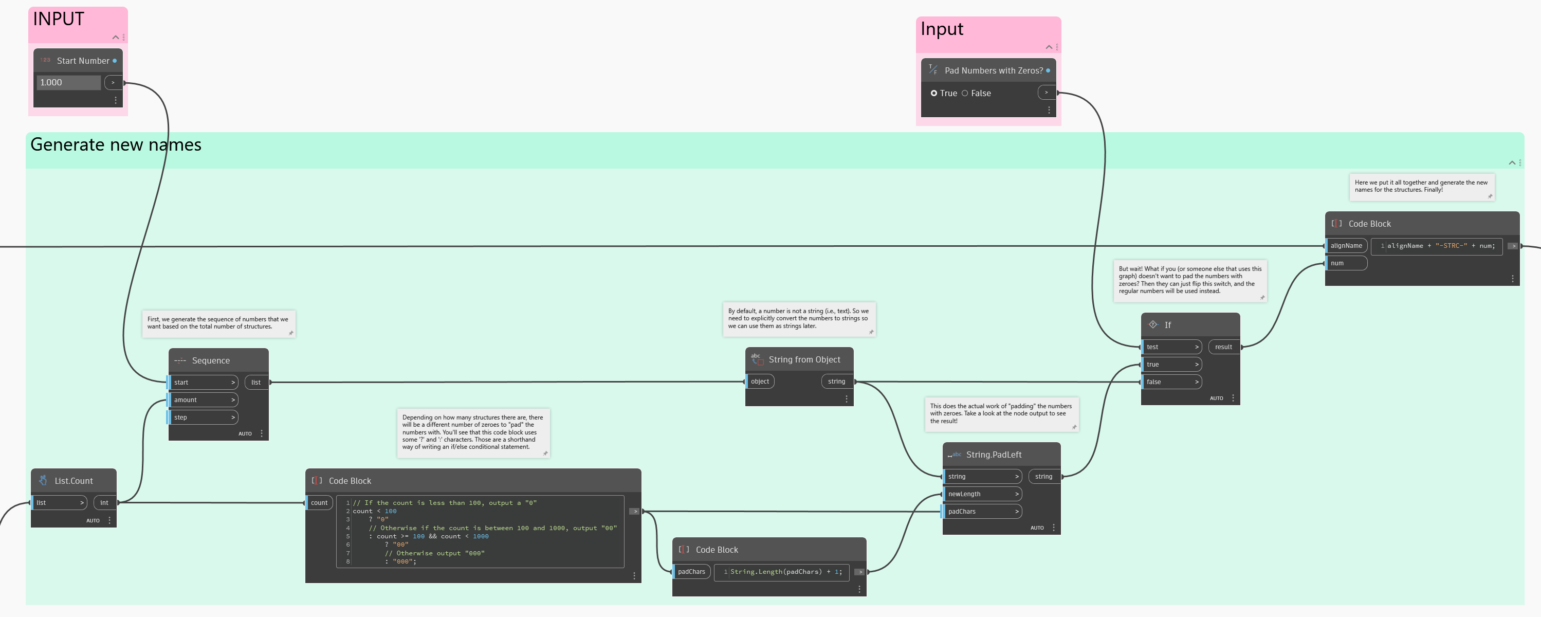 The last bit of work that we need to do is create the new names for the Structures. The format that we'll use is `<alignment name>-STRC-<number>`. There's a few extra nodes here to pad the numbers with extra zeros if desired (e.g., "01" instead of "1").