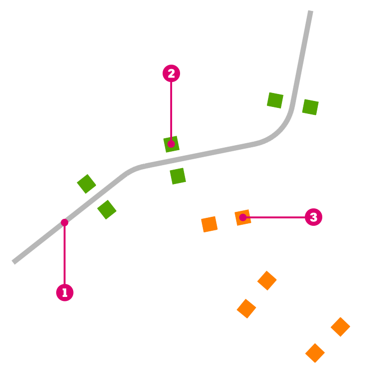 We'll use these points to get the station and offset of the Structures relative to a selected Alignment.