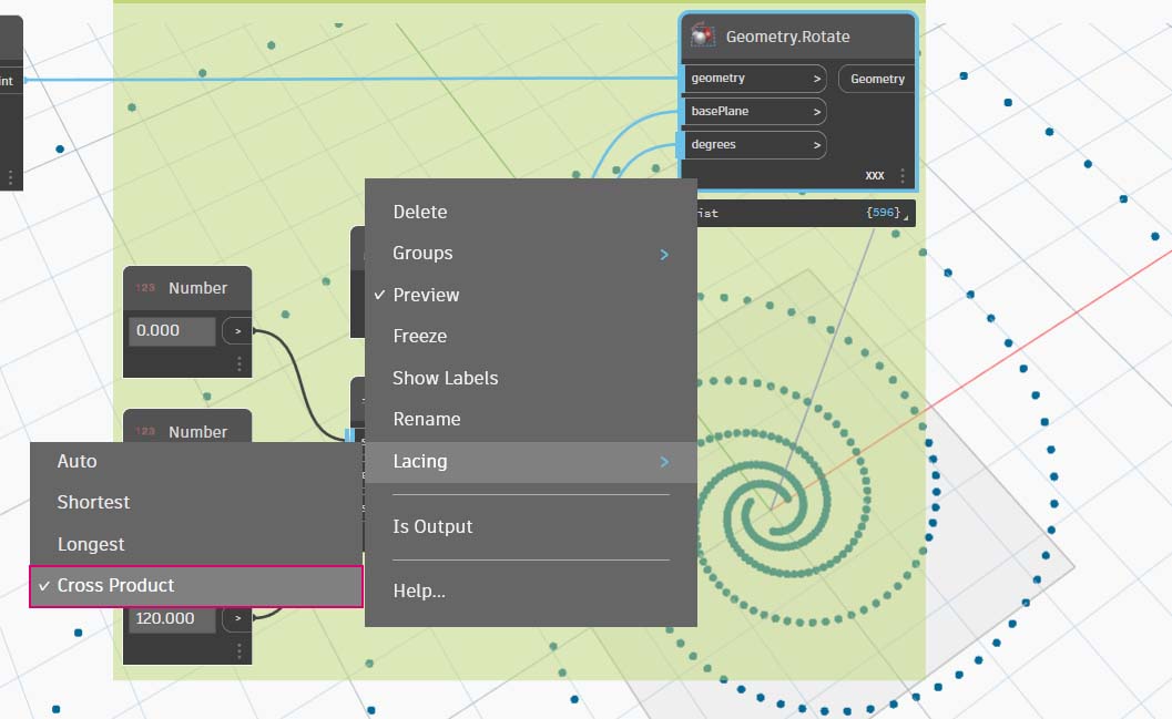 > a. **Geometry.Rotate**: existen varias opciones de **Geometry.Rotate**; asegúrese de que ha elegido el nodo que contiene las entradas *geometry*, *basePlane* y *degrees*. Conecte **Point.ByCoordinates** en la entrada geometry. Haga clic con el botón derecho en este nodo y asegúrese de que el encaje se haya establecido en "Producto vectorial".
