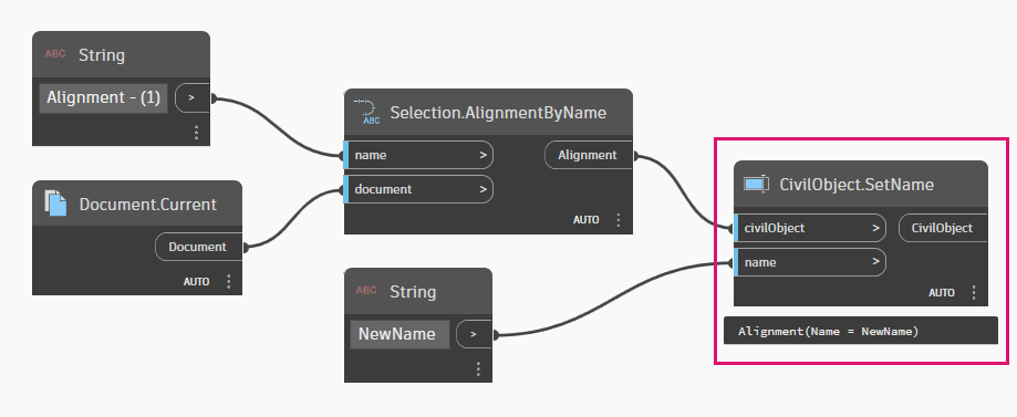 Supongamos que su objetivo es cambiar el nombre de la alineación. A partir de aquí, el siguiente nodo que añadiría es CivilObject.SetName.