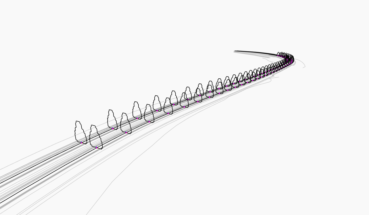 Ahora tenemos que crear de alguna manera una matriz de los perfiles de los vehículos a lo largo de las líneas características. Lo que vamos a hacer es transformar la geometría desde la definición de bloque del perfil del vehículo mediante el nodo **Geometry.Transform**. Se trata de un concepto difícil de visualizar, así que antes de ver los nodos, he aquí un gráfico que muestra lo que va a ocurrir.