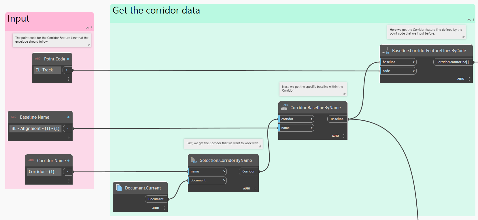 El primer paso es obtener datos de obra lineal. Seleccionaremos el modelo de obra lineal por su nombre, obtendremos una línea base específica dentro de la obra lineal y, a continuación, conseguiremos una línea característica dentro de la línea base por su código de punto.