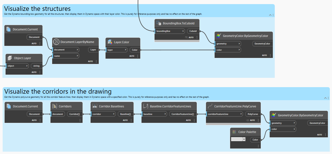 Puede ser útil aprovechar la vista preliminar 3D en segundo plano de Dynamo para visualizar las salidas intermedias del gráfico en lugar de solo el resultado final. Algo fácil que podemos hacer es visualizar los cuadros delimitadores de las estructuras. Además, este conjunto de datos concreto tiene una obra lineal en el documento, por lo que podemos incorporar la geometría de línea característica de obra lineal en Dynamo para proporcionar contexto en relación con la ubicación de las estructuras en el espacio. Si el gráfico se utiliza en un conjunto de datos sin obras lineales, estos nodos no harán nada.