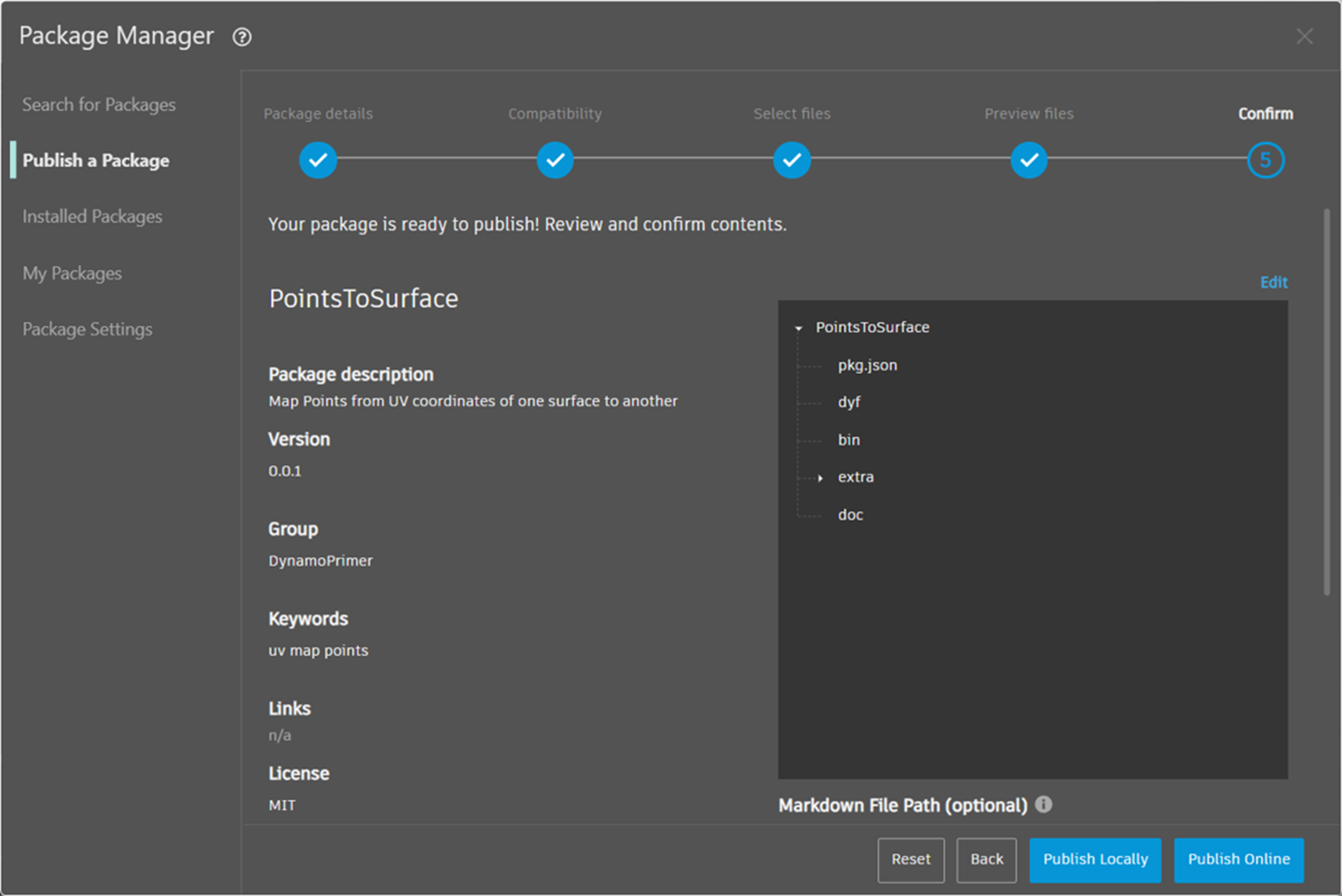 Remplissez les informations pertinentes comme dans l’image ci-dessus et choisissez *« Publier localement »* Notez que le champ Groupe définit l’élément principal accessible à partir du menu Dynamo.