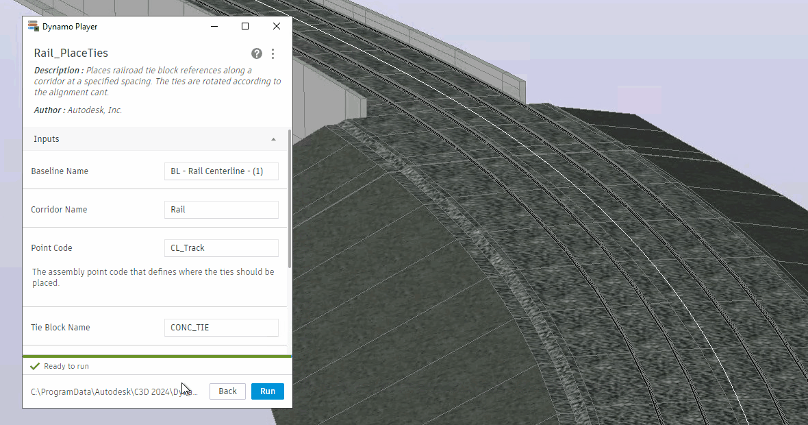 <figure><img src="https://769651524-files.gitbook.io/~/files/v0/b/gitbook-x-prod.appspot.com/o/spaces%2FYIQUByzZePieC1Y9fHzi%2Fuploads%2Fgit-blob-f3e3bb86b5fe71ce45778c697250919b1739fb8b%2FRail_PlaceTies_Player.gif?alt=media" alt=""><figcaption><p>Exécution d’un graphique avec le Lecteur Dynamo et visualisation des résultats dans Civil 3D</p></figcaption></figure>
