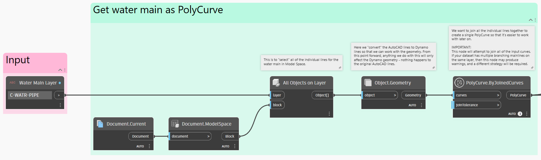 La première étape consiste à intégrer la géométrie de la conduite principale dans Dynamo. Au lieu de sélectionner des lignes ou des polylignes individuelles, nous allons plutôt récupérer tous les objets d’une certaine couche et les regrouper sous la forme d’une polycourbe Dynamo.