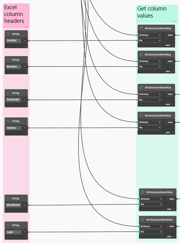 Maintenant que vous disposez des données, vous devez les diviser par colonne (*Projet 3D*, *Ligne de base*, *Code de point*, etc.) afin de pouvoir les utiliser dans le reste du graphique. Pour ce faire, vous pouvez utiliser le nœud **List.GetItemAtIndex** et spécifier le numéro d’index de chaque colonne souhaitée. Par exemple, la colonne *Projet 3D* se trouve à l’index 0, la colonne *Ligne de base* à l’index 1, etc.