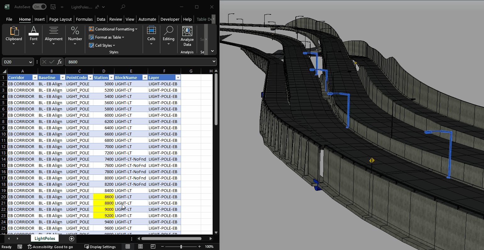 Maintenant que les données Excel sont importées et prêtes à l’emploi, commencez à les utiliser pour obtenir des informations de Civil 3D sur les modèles de projet 3D.