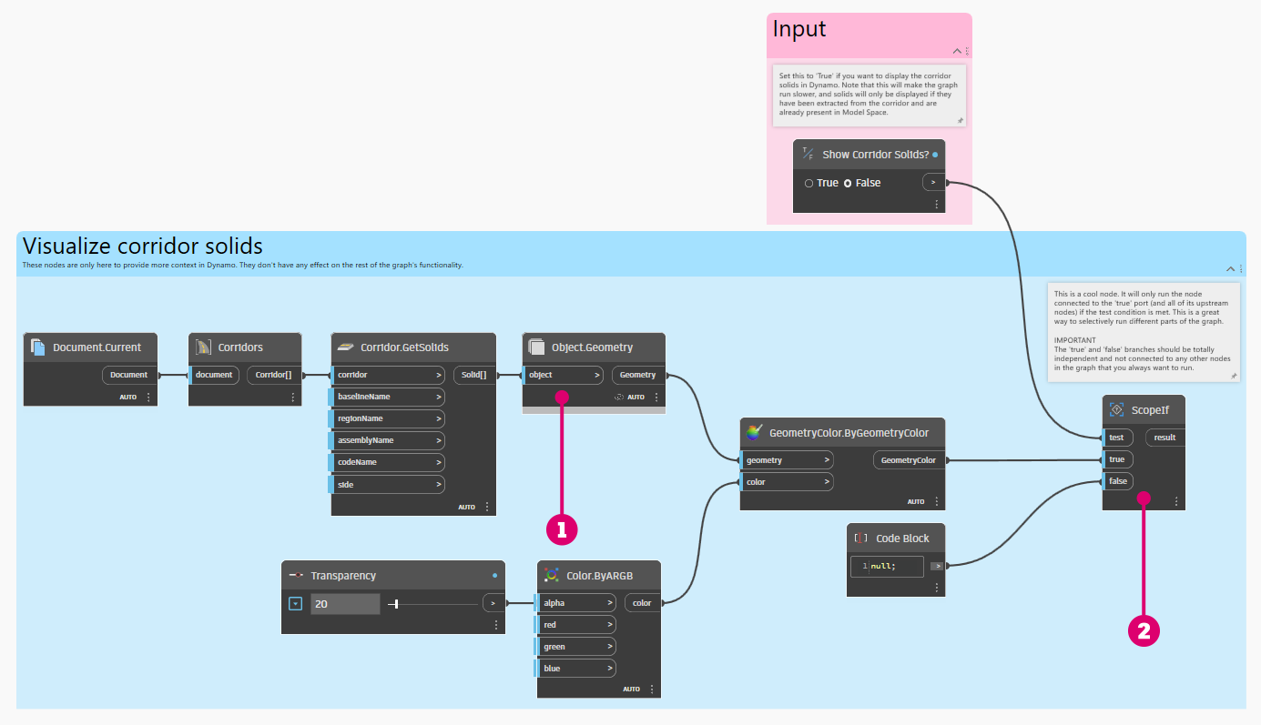 Cependant, il y a autre chose que vous devez prendre en compte. Les solides sont un type de géométrie relativement « lourd », ce qui signifie que cette opération ralentira le graphique. L’idéal serait de disposer d’un moyen simple permettant de *choisir* d’afficher ou non les solides. La solution la plus évidente est de débrancher le nœud **Corridor.GetSolids**, mais cela produira des avertissements pour tous les nœuds en aval, ce qui est un peu gênant. C’est une situation dans laquelle le nœud **ScopeIf** se révèle particulièrement utile.