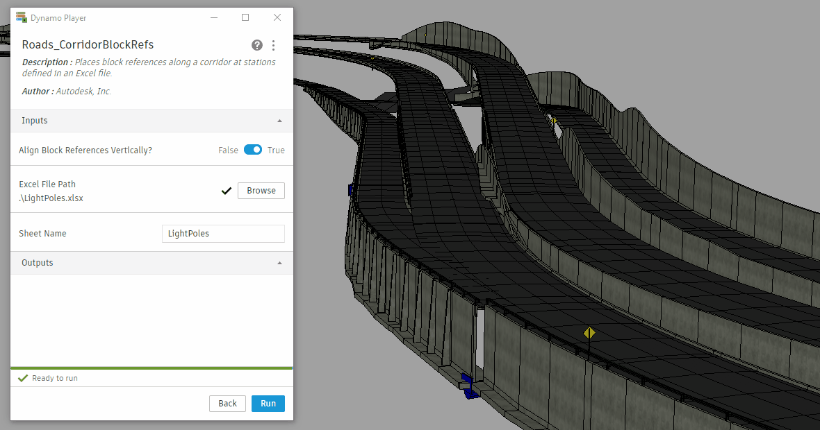 <figure><img src="https://769651524-files.gitbook.io/~/files/v0/b/gitbook-x-prod.appspot.com/o/spaces%2FYIQUByzZePieC1Y9fHzi%2Fuploads%2Fgit-blob-c6559ed7f2c9c93dfb1ca141842c04b414a08e65%2FRoads_CorridorBlockRefs_Player.gif?alt=media" alt=""><figcaption><p>Exécution du graphique à l’aide du Lecteur Dynamo et visualisation des résultats dans Civil 3D</p></figcaption></figure>