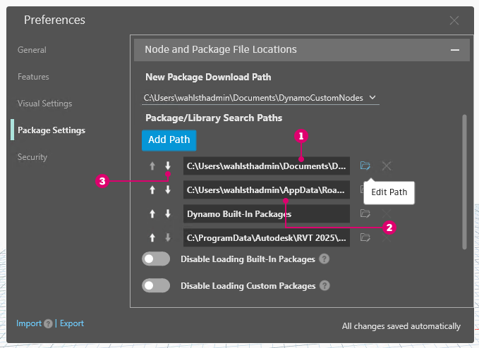 > 3. リスト内でローカル フォルダ パスを下に移動する場合は、パス名の左側にある下向き矢印をクリックします。一番上に表示されているフォルダが、パッケージがインストールされる既定のパスになります。そのため、Dynamo パッケージの既定のインストール パスを既定のフォルダのままにすると、オンライン パッケージをローカルにパブリッシュしたノードと区別することができます。