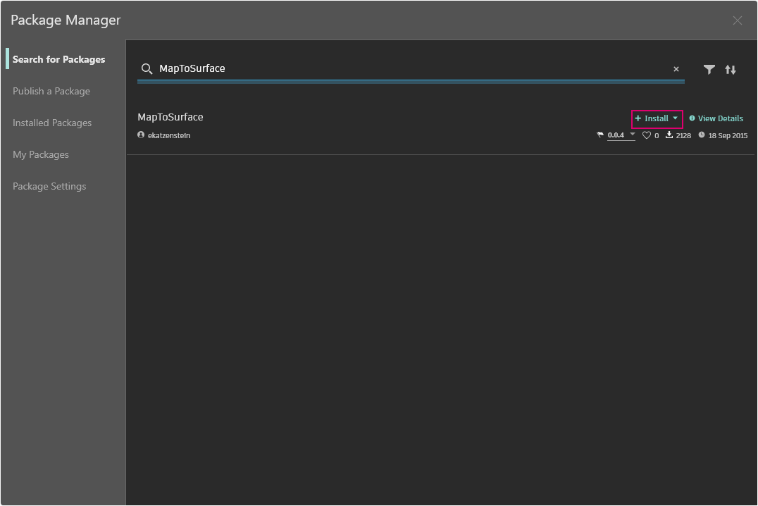 Dynamo で、\[パッケージ] > \[Package Manager]をクリックして、「MapToSurface」(スペースを入れない 1 つの単語)でパッケージを検索します。\[インストール]をクリックしてダウンロードを開始し、パッケージをライブラリに追加します。