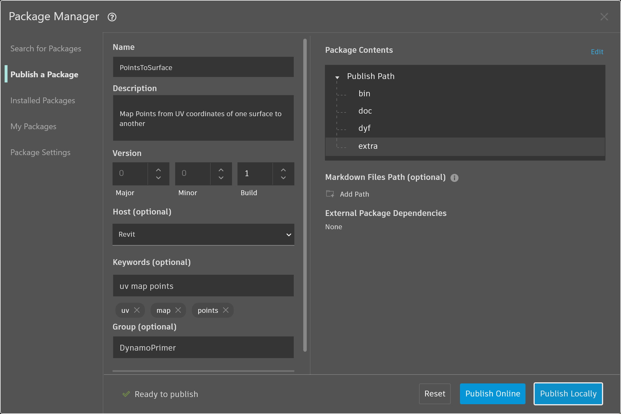 위의 이미지와 유사하게 관련 정보를 채우고 *"로컬로 게시"* 를 선택합니다. 그룹 필드는 Dynamo 메뉴에서 액세스할 수 있는 주 요소를 정의합니다.