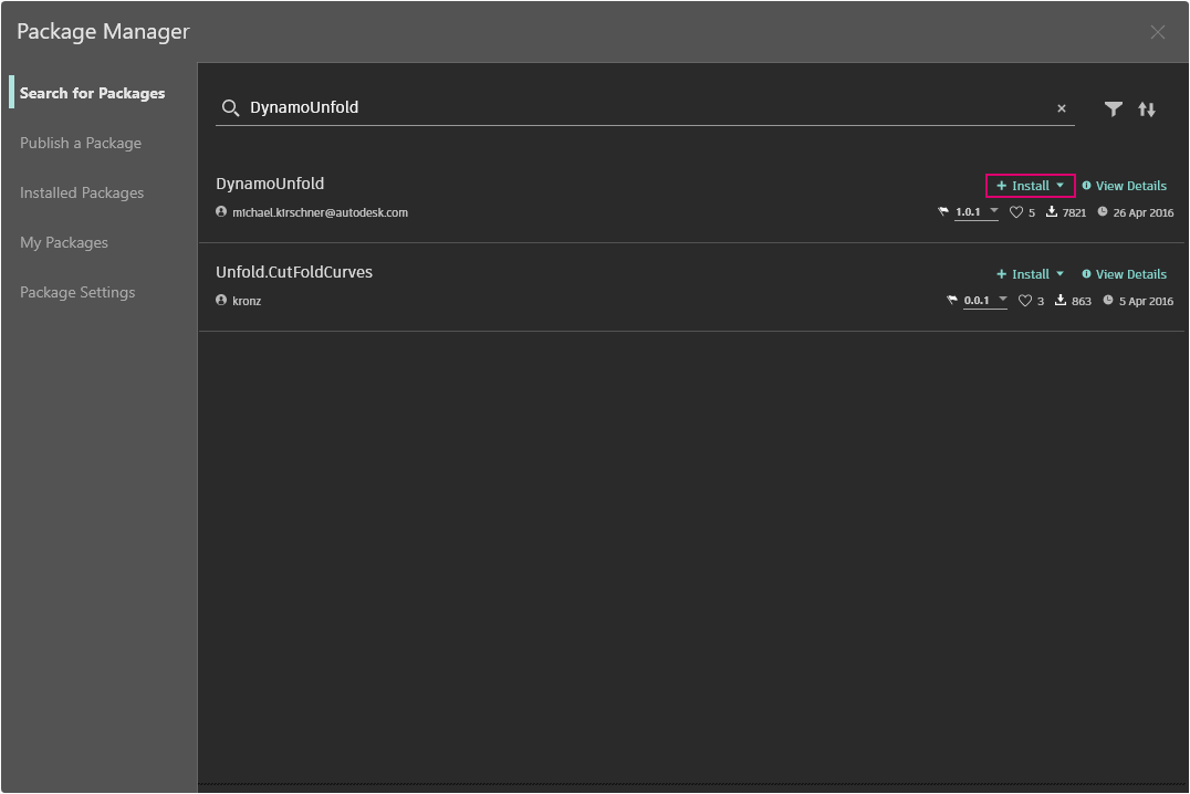 Tym razem poszukamy jednego słowa, *„DynamoUnfold”*. Po wyświetleniu pakietów pobierz je, klikając przycisk Zainstaluj, aby dodać składniki Dynamo Unfold do biblioteki Dynamo.