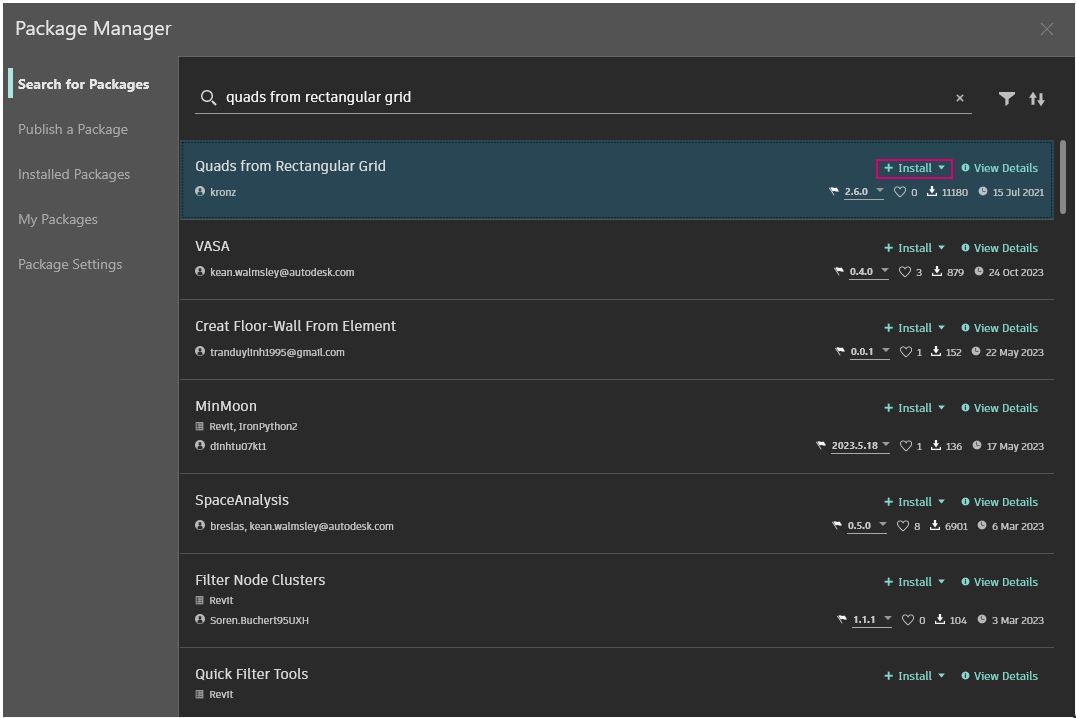 Najprostszym sposobem instalacji pakietu jest użycie opcji menu Pakiety w interfejsie dodatku Dynamo. Przejdźmy od razu do rzeczy i zainstalujmy pakiet teraz. W tym szybkim przykładzie zainstalujemy popularny pakiet umożliwiający tworzenie paneli czworokątnych na siatce.