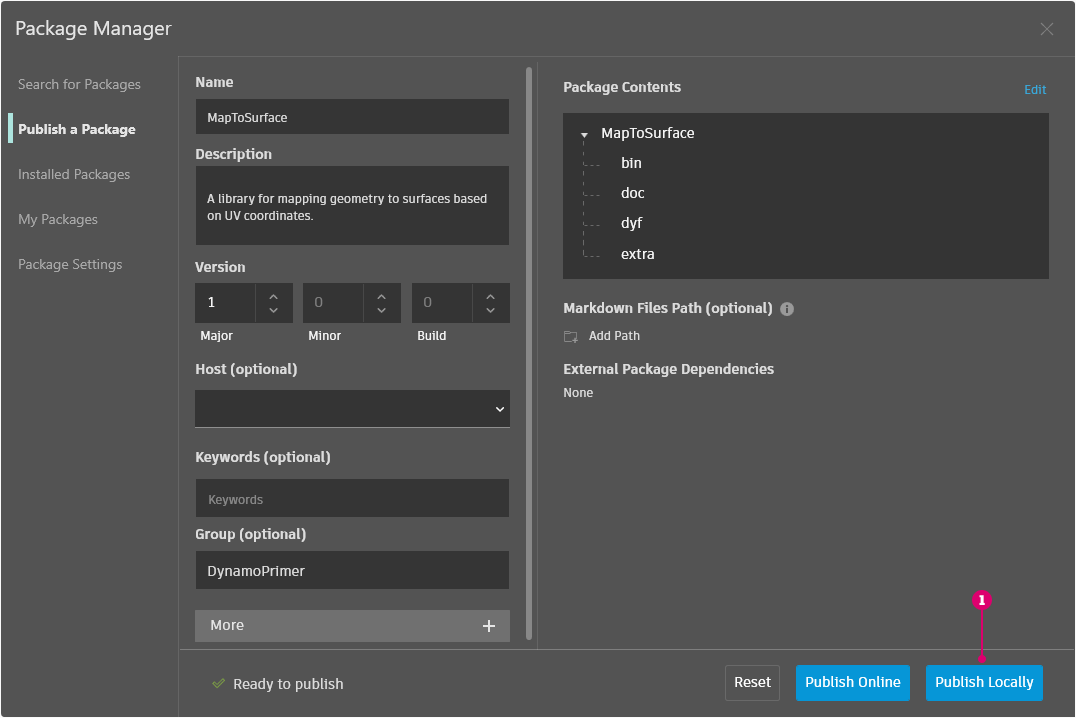 Pakiety i węzły niestandardowe można publikować w środowisku Dynamo Sandbox w wersji 2.17 lub nowszej, o ile nie mają one zależności od nadrzędnego interfejsu API. W starszych wersjach publikowanie pakietów i węzłów niestandardowych jest włączone tylko w dodatku Dynamo dla programu Revit i dodatku Dynamo dla programu Civil 3D.