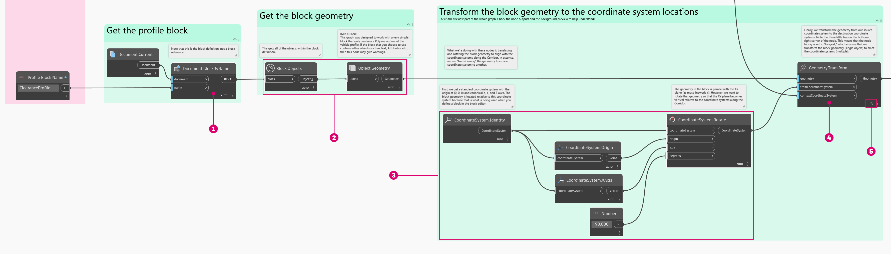 Zasadniczo pobieramy geometrię dodatku Dynamo z pojedynczej definicji bloku i przesuwamy/obracamy ją podczas tworzenia szyku wzdłuż linii charakterystycznej. Świetnie! Oto jak wygląda sekwencja węzłów.
