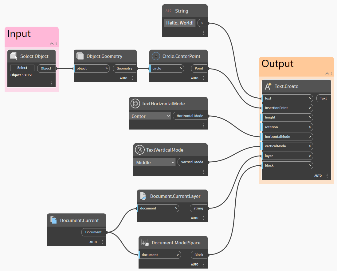 Vamos examinar um exemplo no qual você pode desejar alterar o comportamento da vinculação de objetos padrão do Dynamo. Digamos que você deseje criar um gráfico que posicione o texto no meio de um círculo. No entanto, sua intenção com esse gráfico é que ele possa ser executado repetidamente e posicionar novo texto sempre que qualquer círculo for selecionado. Veja a seguir a aparência do gráfico.