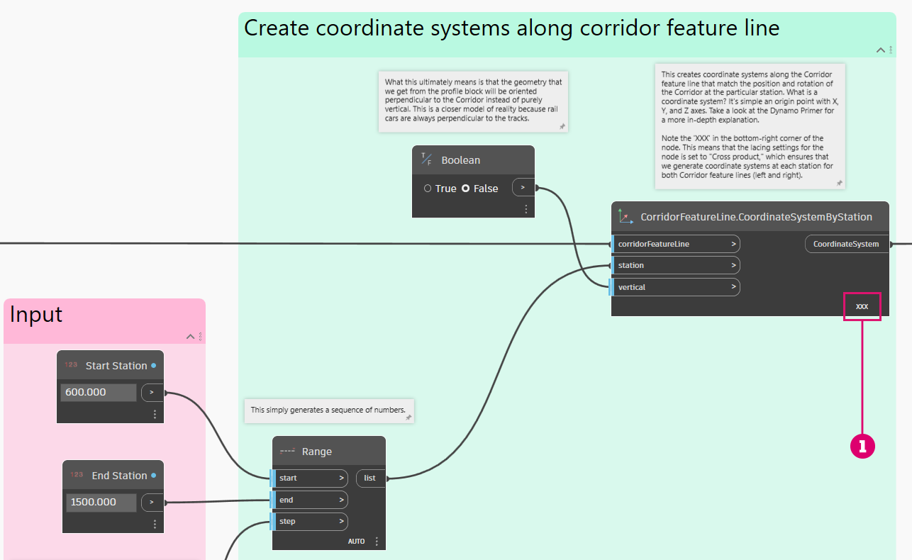 > 1. Обратите внимание на **XXX** в правом нижнем углу узла. Это означает, что для параметров переплетения узла задано значение *Векторное произведение*. Это необходимо для создания систем координат с одинаковыми значениями пикетов для обеих характерных линий.