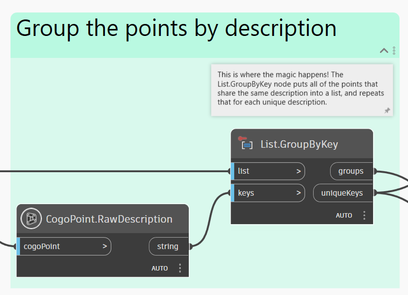 Теперь, когда мы получили все точки COGO, необходимо разделить их на группы на основе их описаний. С этой задаче блестяще справится узел List.GroupByKey. По сути, он группирует все элементы с одинаковым ключом.