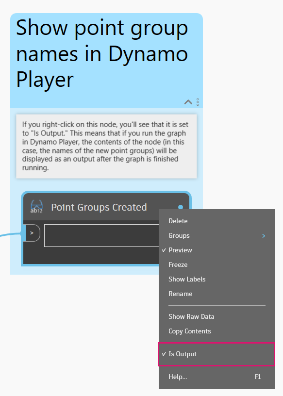 Если задать для узла значение Является выводом, его содержимое будет отображаться в выводе проигрывателя Dynamo.