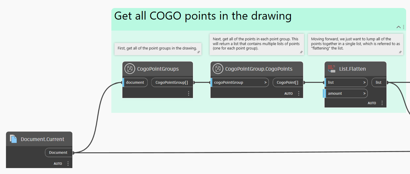 Сначала необходимо получить все группы точек в документе, а затем все точки COGO в каждой группе. В результате мы получим вложенный список, или список списков. Если мы выровняем все элементы в один список с помощью узла List.Flatten, это упростит дальнейшую работу.