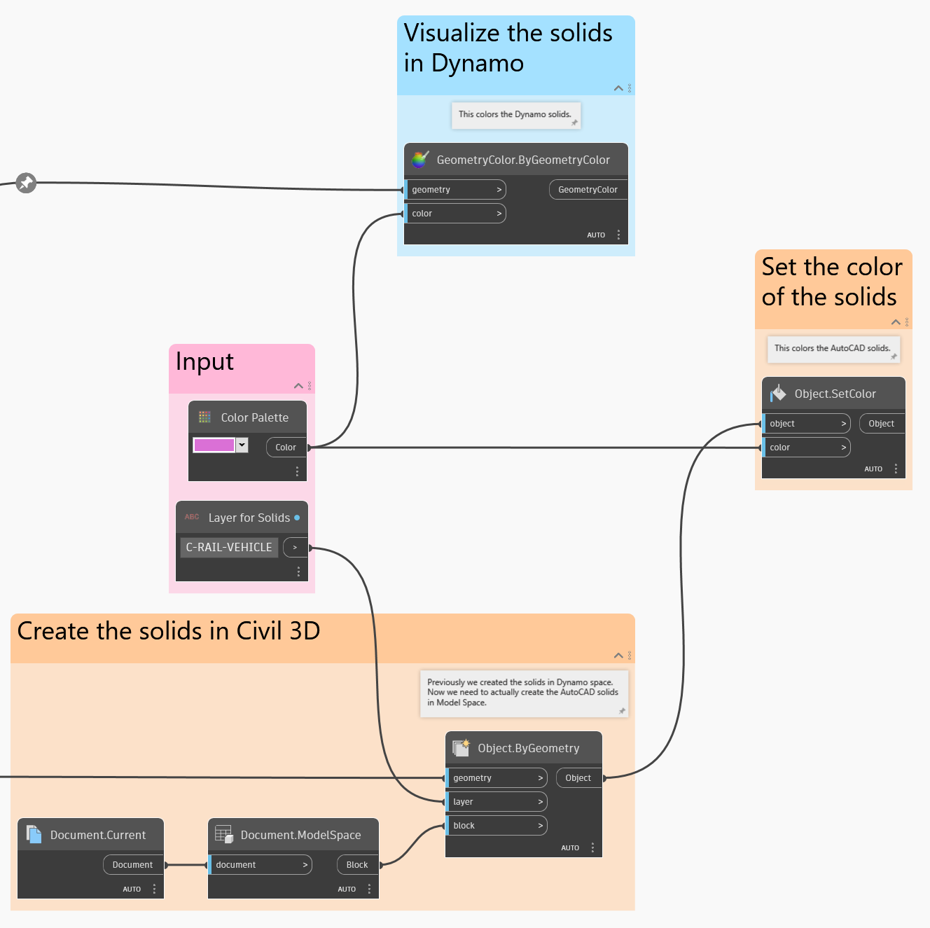 我们的最后一步是将生成的实体输出到模型空间中。我们还会为这些实体赋予颜色，以使它们易于区分。