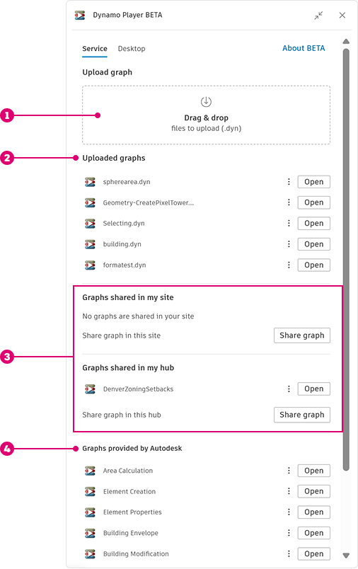 在“服务”和“桌面”选项卡上，您会看到一个标有 **Upload graph** \[ 1 ] 的区域，您可以在其中拖放 .dyn 文件以将其添加到 Player。或者，单击该区域以打开用于浏览和添加文件的对话框。