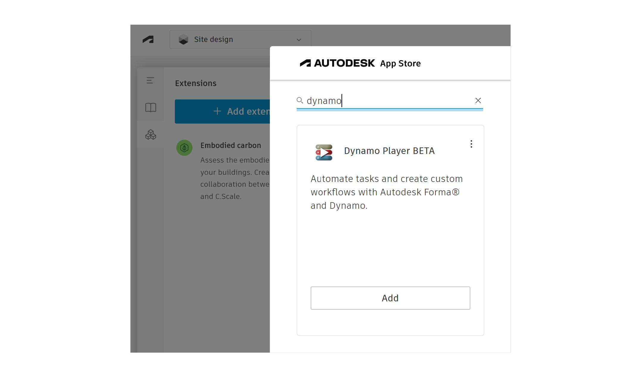 1. 在 Forma 站点中，转到左侧侧栏中的\*\*“Extensions”**然后单击**“Add extension”\*\*。这将打开 Autodesk App Store。