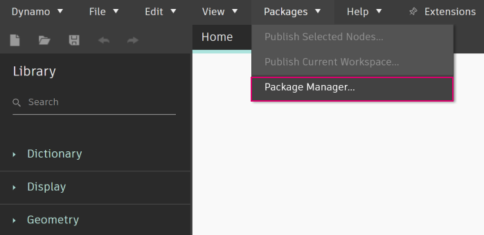 在 Dynamo 中,前往 「套件」>「Package Manager...」
